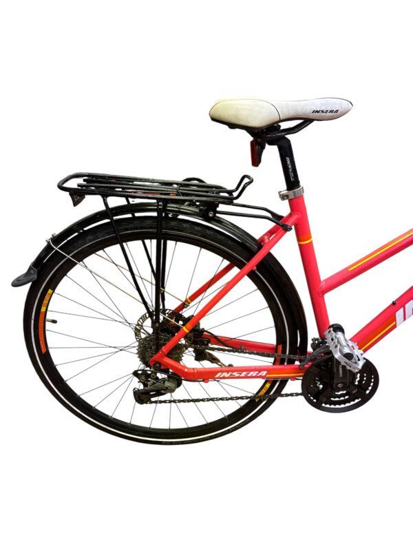 Müügile on tulnud väga heas korras ja pilkupüüdev roosat värvi jalgratas Insera Reflex 360. Tegemist on universaalse ja töökindla sõiduvahendiga, millel on kerge 48 cm alumiiniumraam (sobib ideaalselt pikkusele 160-170 cm) ja suured 28-tollised jooksud, mis tagavad hea veerevuse nii asfaldil kui ka kruusateedel. Sujuva sõidu kindlustab 24-käiguline Shimano ülekanne (taga kvaliteetne Acera ja ees Tourney vahetaja), mis pakub piisavalt valikut nii järskudeks tõusudeks kui ka kiireteks sirgeteks. Turvalisuse tagavad täpsed ketaspidurid, mis toimivad efektiivselt iga ilmaga. Ratas on täisvarustuses: olemas on pakiraam, mugavaks ja ohutuks sõiduks vajalik ohutuspakett (helkurid ja kell) seisujalg ning püstisem sõiduasend, mis muudab ka pikemad tiirud nauditavaks. Suurepärane valik igapäevaseks liikumiseks või tervisespordiks!